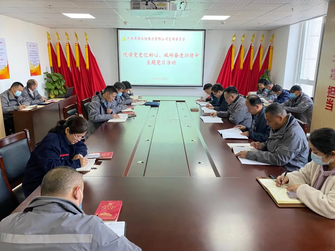 為扎實推進黨史學習教育,結(jié)合公司常態(tài)化制度化學習要求,10月25日下午,菏澤永恒熱力有限公司黨支部組織開展“悅讀黨史憶初心、砥礪奮進擔使命”主題黨日活動,黨支部書記肖培飛主持會議,全體黨員、發(fā)展對象、入黨積極分子、中層副職及以上人員參加本次會議。